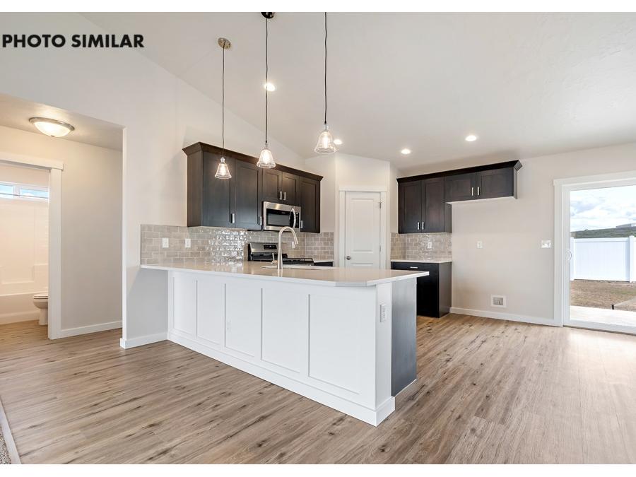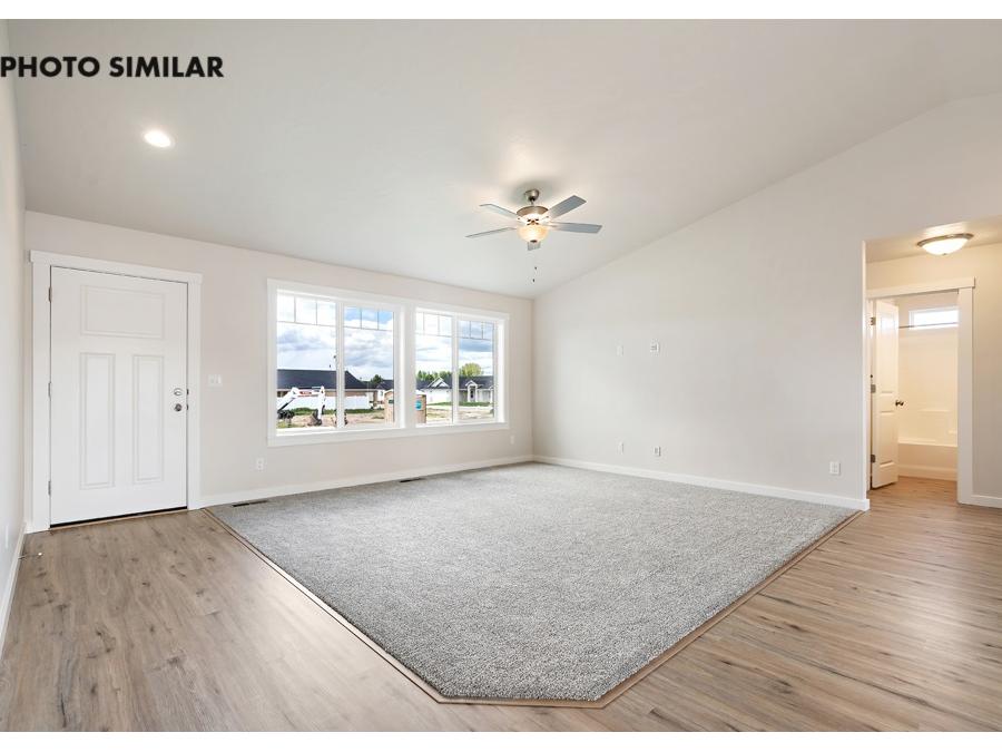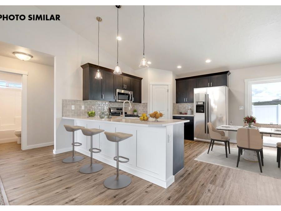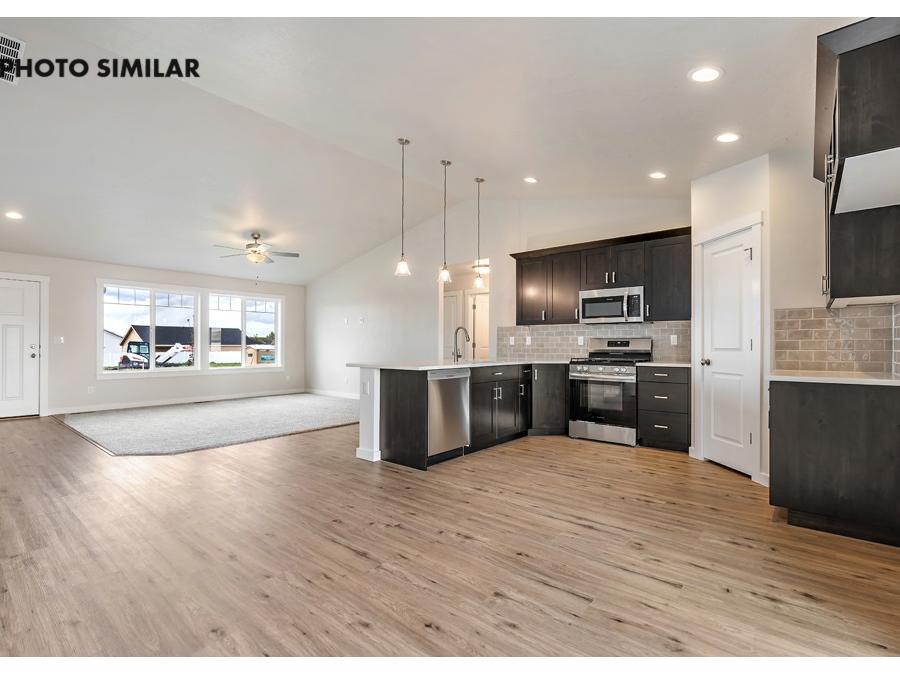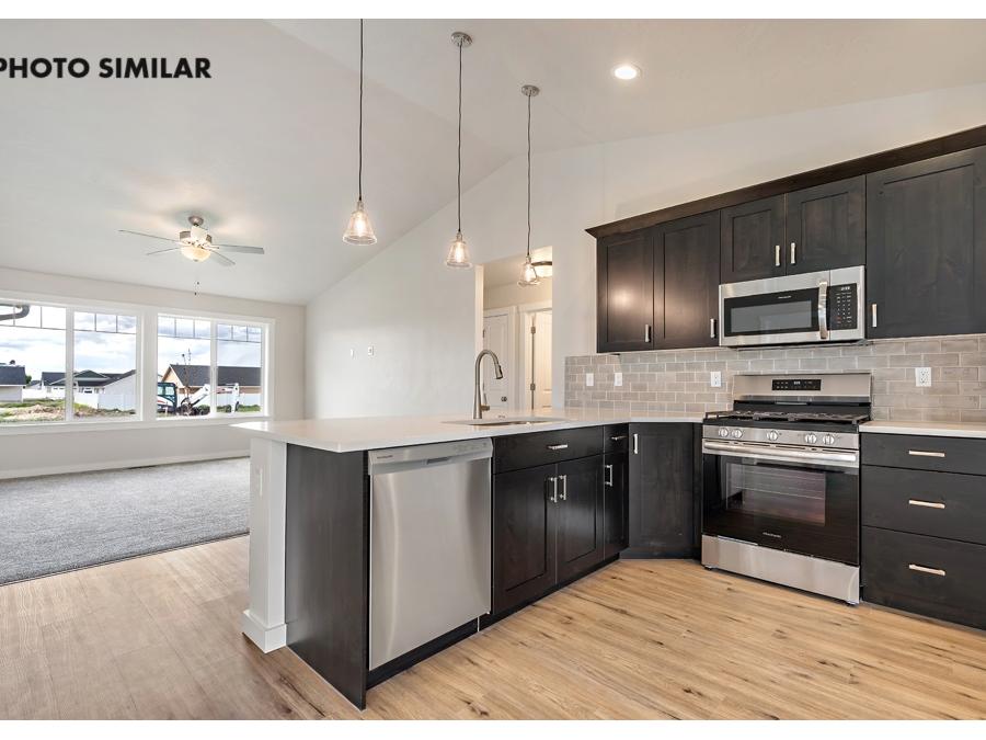 The Chamberlain, at 1,404 sq. ft., features three bedrooms, two bathrooms, a spacious kitchen and dining area, and a two-car garage. As you enter, you’re greeted by a cozy great room that sets the tone for the home. Beautiful granite countertops flow throughout the kitchen, which features Knotty Alder cabinets and stainless steel appliances. *Floorplan price is pre-lot.